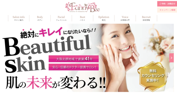 | ファニービー 高槻店 | ![]() | 公式 | 詳細 | ・痩身コンテスト優勝の確かな実績 ・一人ひとりに合わせたオーダーメイド施術 ・痩身からフェイシャルまでトータル対応 |