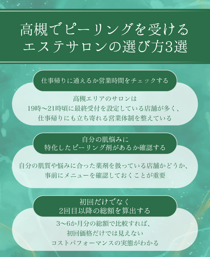本記事では、高槻で毛穴洗浄やピーリングを受けられるエステサロンのおすすめ10院と、サロン選びのポイント、メリット・デメリットを紹介しました。