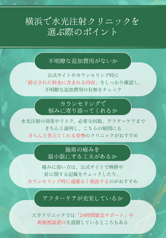 クリニック選びの際は、以下のポイントをチェックし、自分が安心して通える医院を見つけましょう。